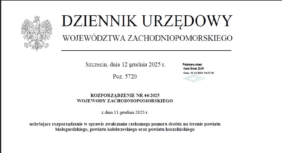 W załączeniu Rozporządzenie Nr 44/2025 Wojewody Zachodniopomorskiego z dnia 11 grudnia 2025 r. uchylające rozporządzenie w sprawie zwalczania rzekomego pomoru drobiu na terenie powiatu białogardzkiego, powiatu kołobrzeskiego oraz powiatu koszalińskiego.