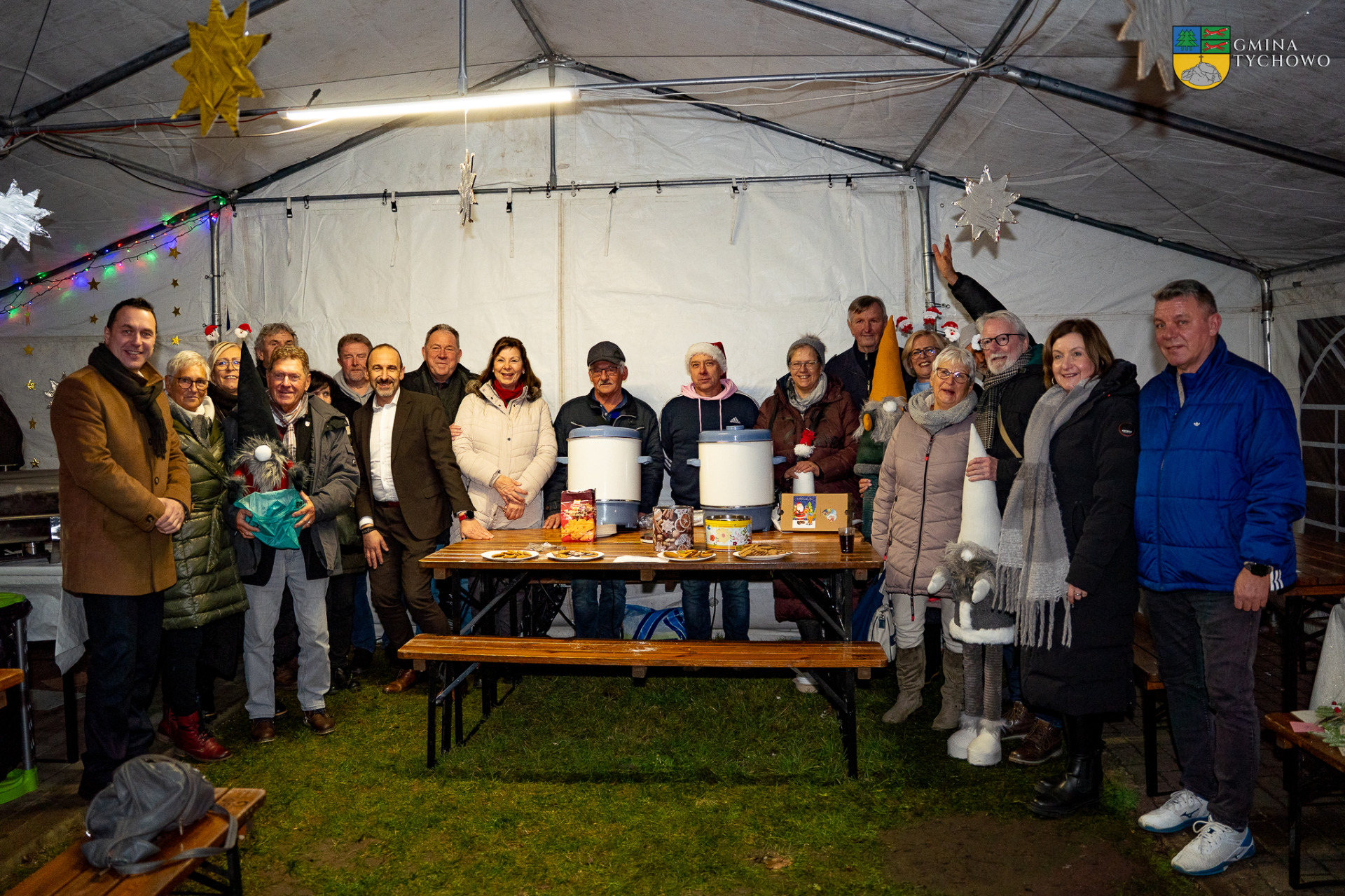 Pobyt delegacji przypadł na wyjątkowy, przedświąteczny czas, który sprzyjał integracji, budowaniu relacji i wzmacnianiu wzajemnego zaufania. Kulminacyjnym punktem wizyty był Kiermasz Bożonarodzeniowy, zorganizowany 19 grudnia 2025 r. przy Gminnym Ośrodku Kultury w Tychowie. Wydarzenie zgromadziło licznych mieszkańców, lokalnych wystawców oraz gości z Niemiec, stwarzając doskonałą przestrzeń do wspólnego przeżywania tradycji i rozmów w świątecznej atmosferze. Delegacja z Neverin aktywnie włączyła się w kiermasz, prezentując własne stoisko, na którym serwowano grzaniec oraz świąteczne ciasteczka, co spotkało się z dużym zainteresowaniem uczestników i dodatkowo podkreśliło integracyjny charakter wydarzenia.